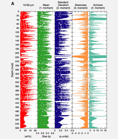 T. Moerz, und T.C.W. Wolf-Welling, 2001. Data report: Fine-fraction grain-size distribution data and their statistical treatment and relation to processes, Site 1095 (ODP Leg 178, western Antarctic Peninsula). In Barker, P.F., Camerlenghi, A., Acton, G.D., und Ramsay, A.T.S. (Eds.), Proc. ODP, Sci. Results, 178 [Online]. Available here: Publications