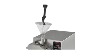 With the FRITSCH standard funnel free-flowing bulk solids as well as straw, films or similar materials can be inserted at full length. Both ends of the plunger of the funnel for long and bulk solids can be utilised: the small end for adding of long goods and the wide end for bulk solids.